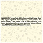 Tomato Paste (20%), Gingelly oil, Salt, Sugar, Mix of all or any one ingredients (Tamarind extract, Lemon powder & Raw Mango powder), Garlic, Ginger, Toor dal (Red gram split), Curry leaves, Mustard seeds, Cumin seeds, Asafoetida, Water and Spices. ALLERGEN ADVICE: Contains Mustard and Sesame.