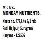 Manufactured & Marketed By: MONDAY NUTRIENTS. Khata no. 477,kita 9/1 rak Patli Hajipur, Gurugram Haryana-122506 & Global Commodities. C5/56 First Floor Vasant Kunj, New Delhi - 110070 Fssai No. 13320009000043