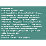 Amla Juice (Emblica Officinalis, Fr.)30ml, Pudina Juice (Mentha viridis, Ap.) 12.43ml, Nimbu Juice (Citrus limon, Fr.) 8ml, and extract derived from: Dhaniya (Coriandrum Sativum, Fr.) 5g, Sunthi (Zingiber